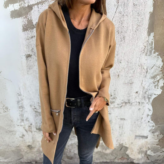 Adelle - Langer, warmer Mantel mit Reißverschluss und Kapuze