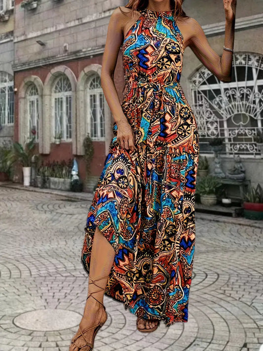 Isabelle | Ethnic Floral Print Boho ärmelloses Kleid mit Gürtel