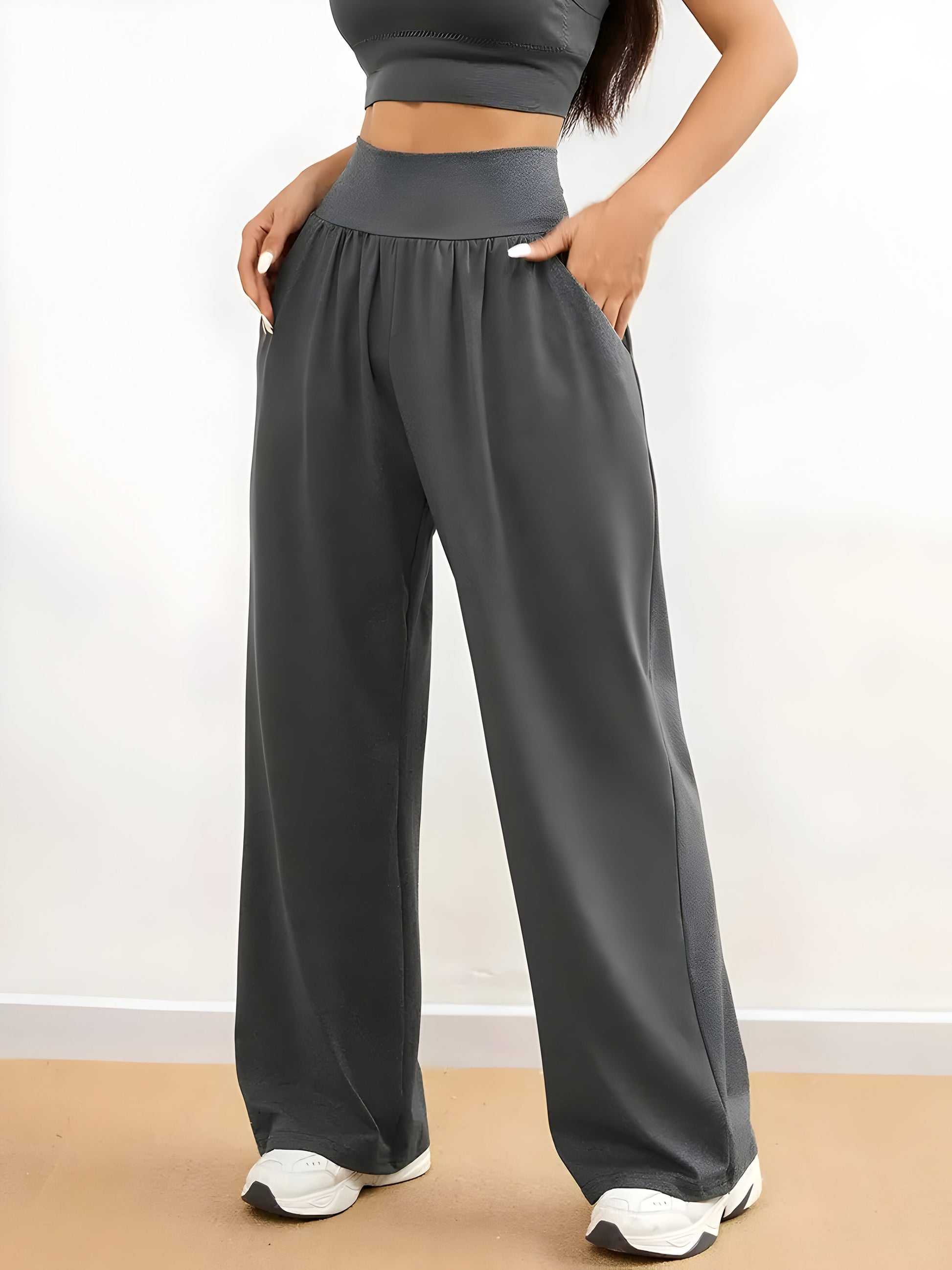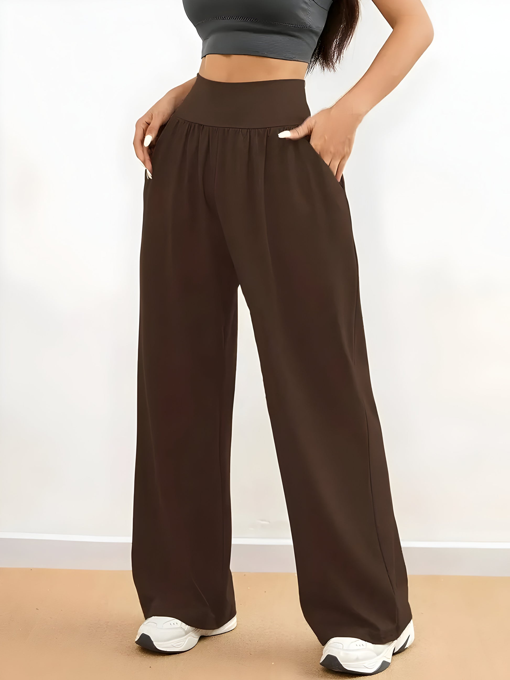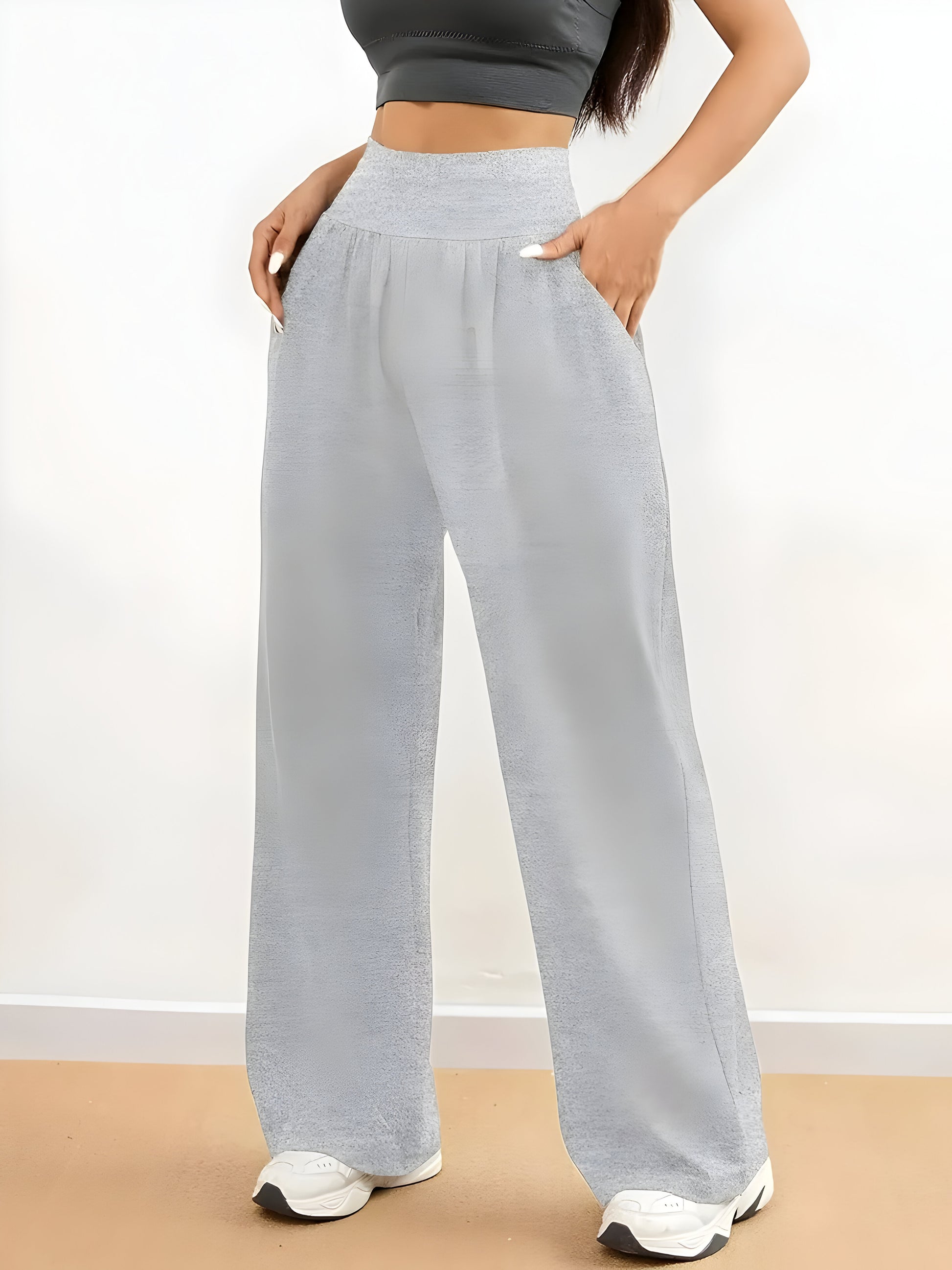 Ob beim Yoga, beim Spaziergang oder einfach zu Hause – diese hochtaillierten, weit geschnittenen Hosen bieten dir den perfekten Mix aus Komfort und Style. Das lockere Design mit elastischem Bund schmeichelt jeder Figur und lässt dich frei bewegen, während die praktischen Taschen Platz für deine Essentials bieten.