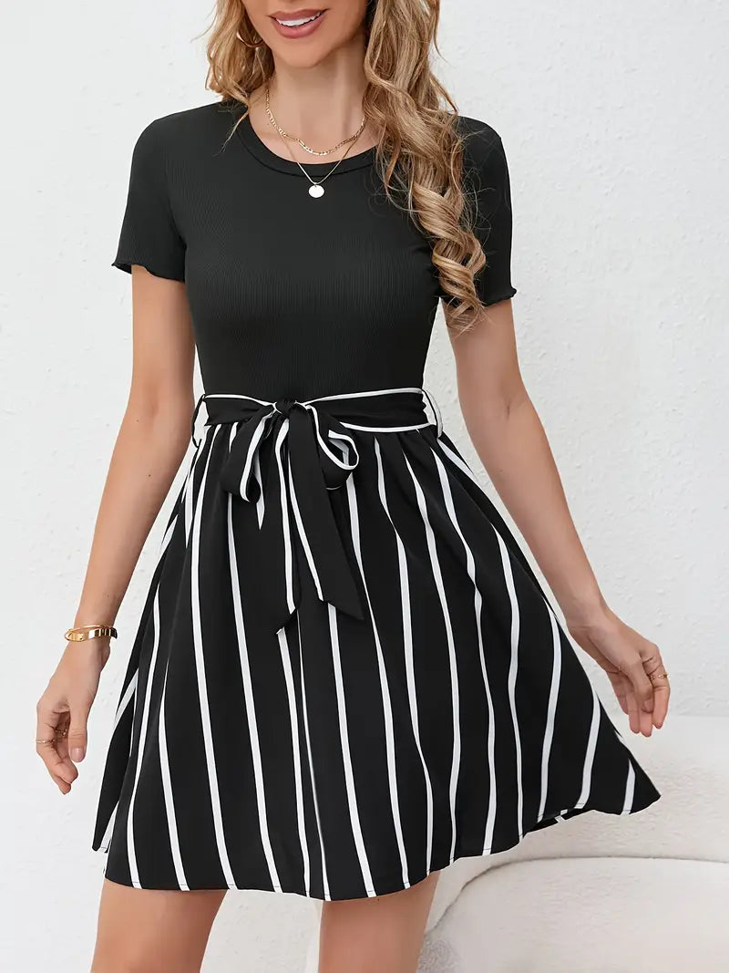 Edna | Neu Gestreiftes Patchwork-Kleid in A-Linie mit Kordelzug