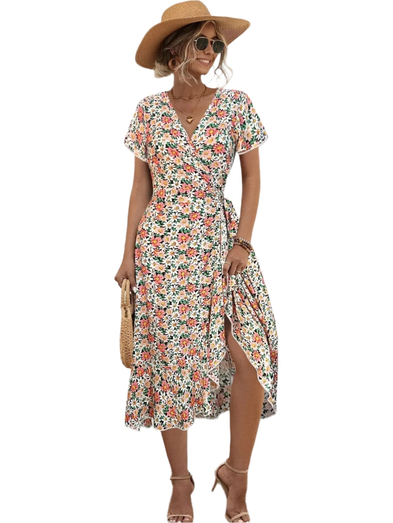 Tauche ein in graziöse Femininität mit einem Kleid, das sich so leicht bewegt wie du. Das schmeichelhafte Wickeldesign, verziert mit einem verspielten Volant-Saum und einem verstellbaren Taillengürtel, betont deine Figur und verleiht dir ein luftiges Tragegefühl. Ob beim Stadtbummel, am Strand oder auf einer Sommerveranstaltung – dieses Kleid sorgt dafür, dass du stilvoll auffällst.