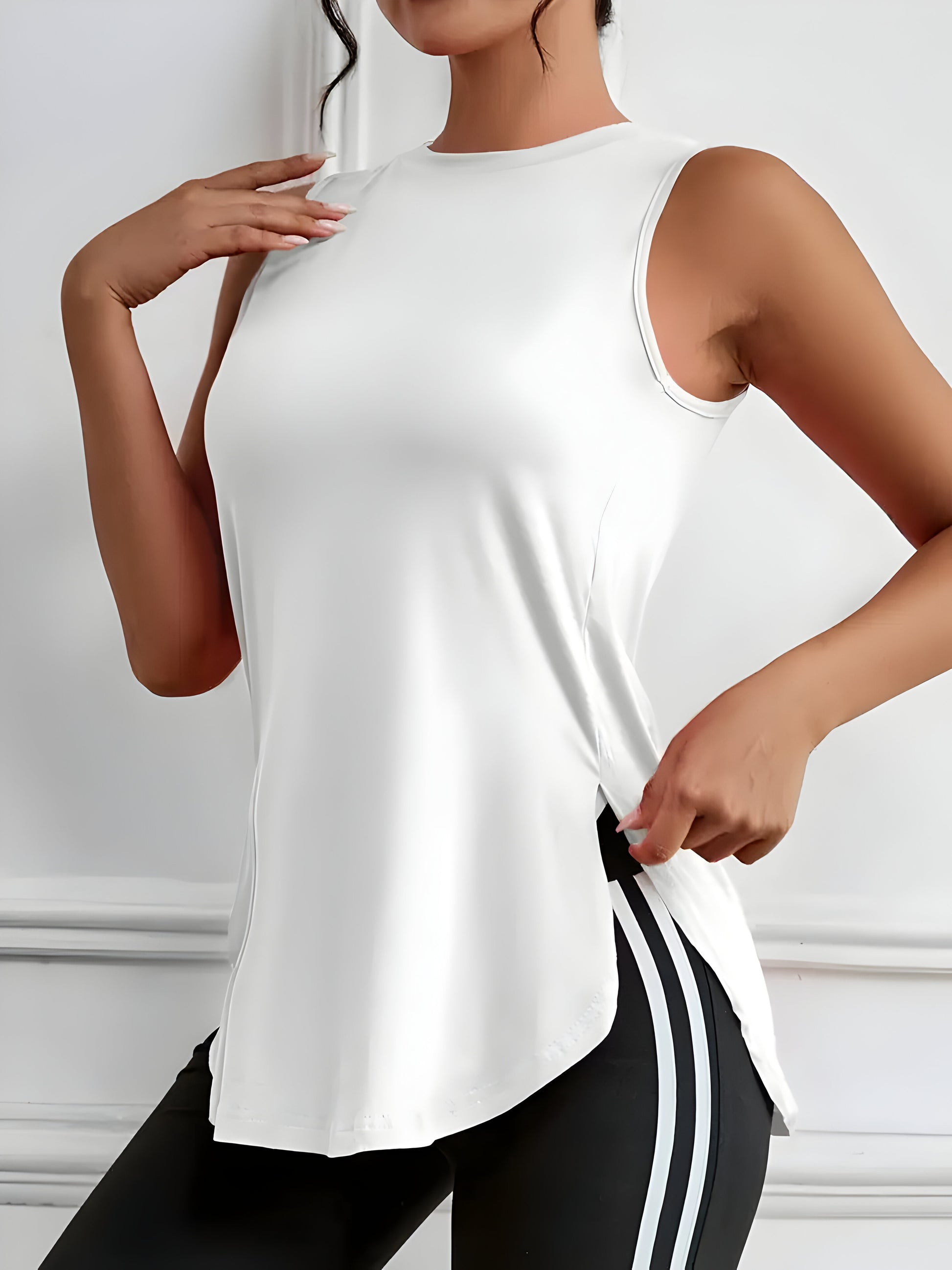 Bewege dich mit Selbstbewusstsein – egal, ob beim Yoga oder im Alltag. Dieses ärmellose, dehnbare Tanktop passt sich deinem aktiven Lebensstil an und verleiht dir einen Hauch von müheloser Eleganz. Der asymmetrische Seitenschlitz sorgt nicht nur für eine bessere Belüftung, sondern auch für eine schmeichelhafte, fließende Silhouette.