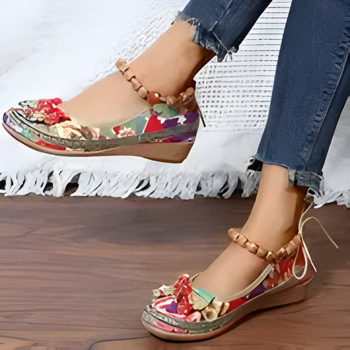 Das tribalinspirierte Blumenmuster und der zarte Knöchelriemen sorgen für einen stilvollen, femininen Look, der sich mühelos mit Jeans, Kleidern oder luftigen Röcken kombinieren lässt.
