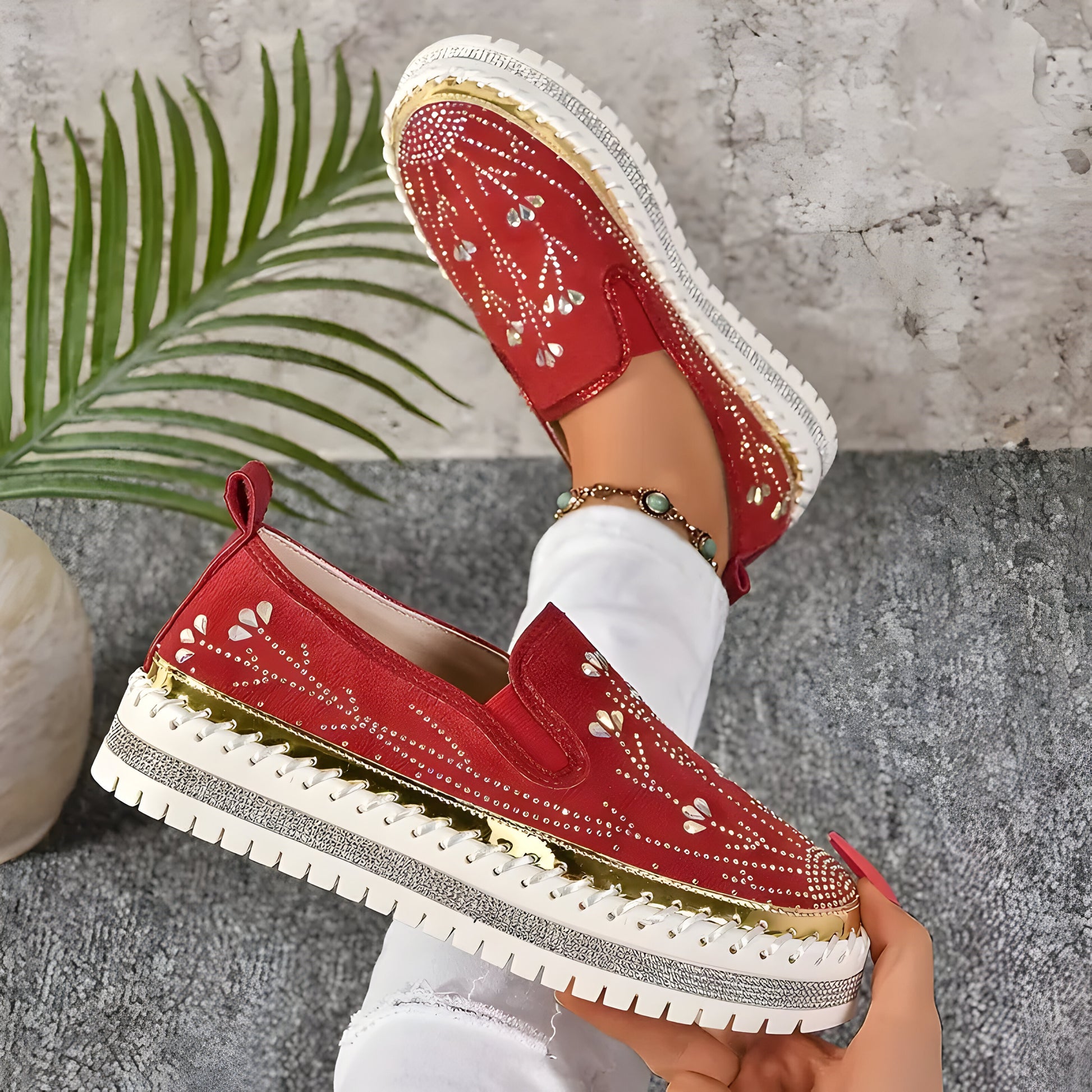 Verleihe deinem Look einen Hauch von Glamour mit diesen funkelnden Slip-On-Loafern. Ob beim Stadtbummel, Brunch oder einem eleganten Abend – diese Plateau-Schuhe mit glänzenden Strass-Details lassen dich überall strahlen.