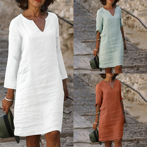 Tauche ein in zeitlose Raffinesse mit diesem wunderschön gestalteten Kleid. Mit einem schmeichelhaften V-Ausschnitt und mittellangen Ärmeln vereint es Komfort und Eleganz auf perfekte Weise. Ob beim entspannten Stadtbummel oder bei einer besonderen Veranstaltung – dieses Kleid hebt deinen Stil mühelos auf ein neues Level und verleiht dir Selbstbewusstsein und Anmut bei jedem Schritt.