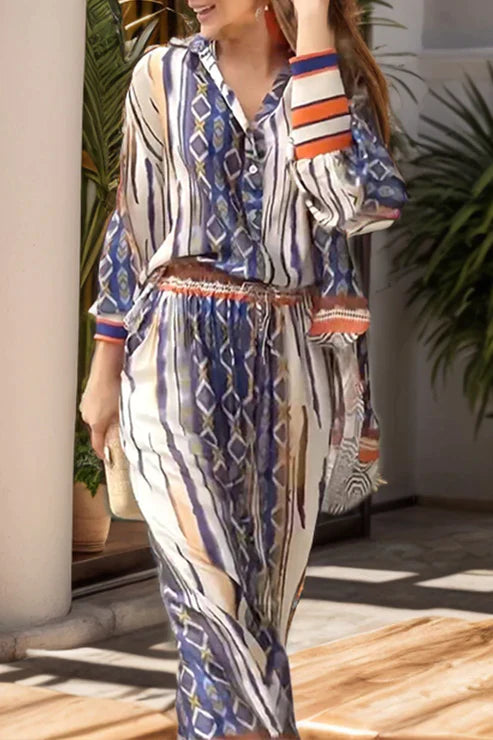 Genießen Sie den luxuriösen Look und das Gefühl unseres eleganten Print-Sets Zalea. Das exquisite Hemd mit Knöpfen ist perfekt mit der passenden Hose mit weitem Bein kombiniert und ergibt ein umwerfendes und raffiniertes Ensemble. Erhöhen Sie Ihren Stil mit diesem Must-Have-Outfit. Kombinieren Sie es mit anderen unifarbenen Hemden, Jeans oder anderen Hosen. Ein tolles Outfit für Beruf und Freizeit.